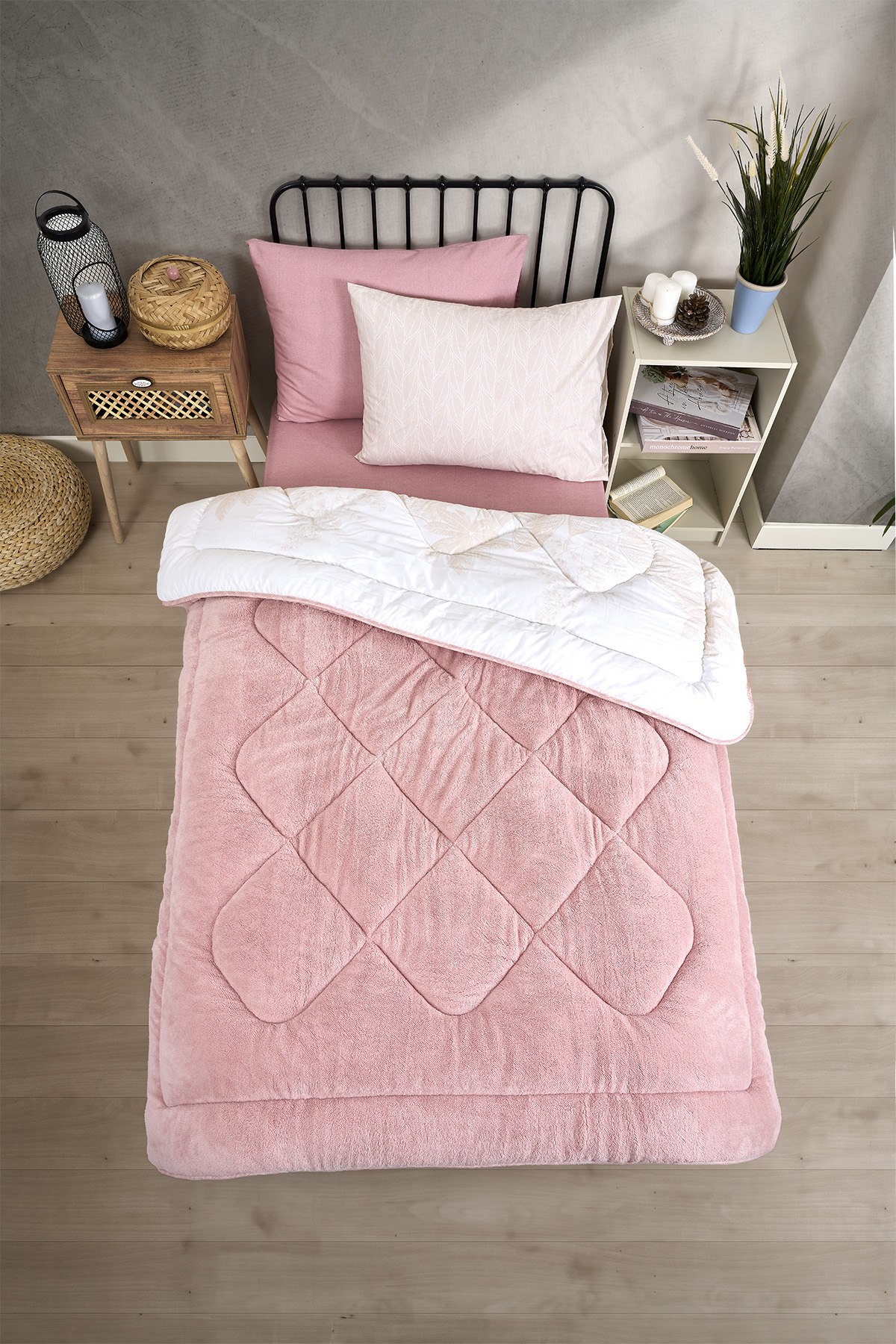 Tek Kişilik Uyku Seti Çift Taraflı Wellsoft Pofuduk Polar Yorgan Yastık Kılıfı ve 100x200 Lastikli Çarşaf - Alena Pudra