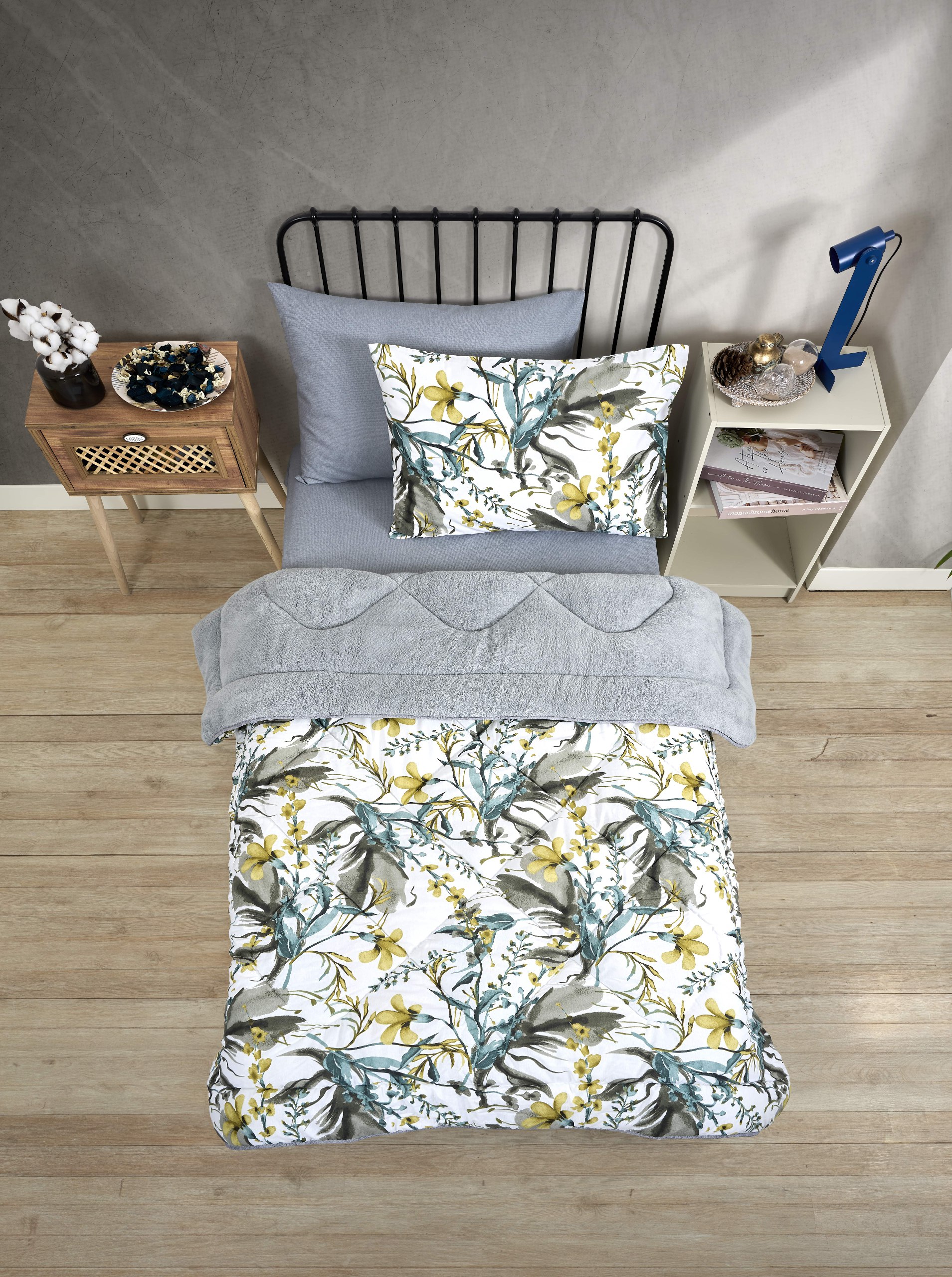 Tek Kişilik Uyku Seti - Çift Taraflı Wellsoft Pofuduk Polar Yorgan, Yastık Kılıfı ve 100x200 Lastikli Çarşaf - Asya Gri
