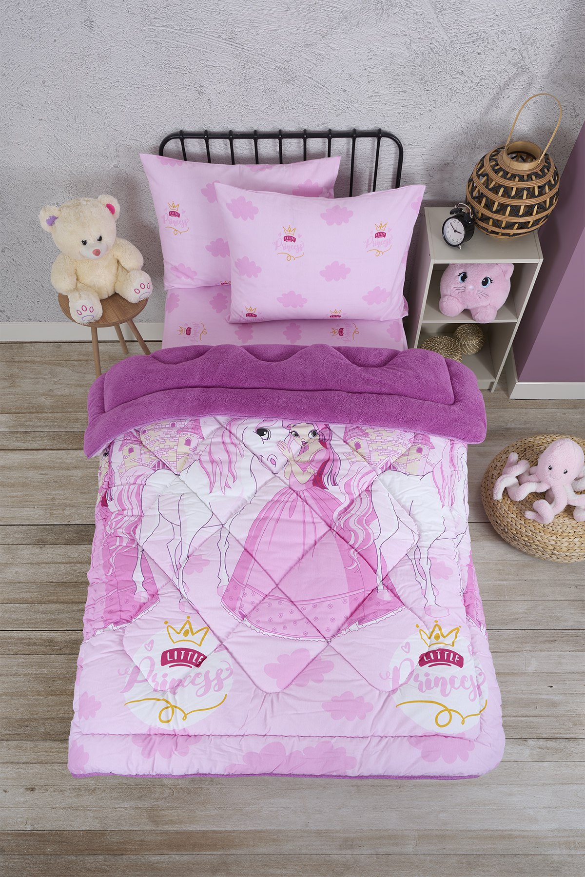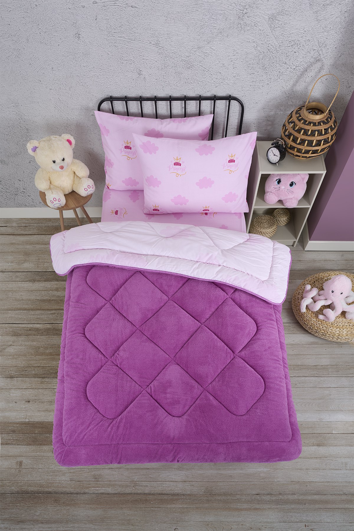 Tek Kişilik Uyku Seti - Çift Taraflı Wellsoft Pofuduk Polar Yorgan, Yastık Kılıfı ve 100x200 Lastikli Çarşaf - Mürdüm Prenses