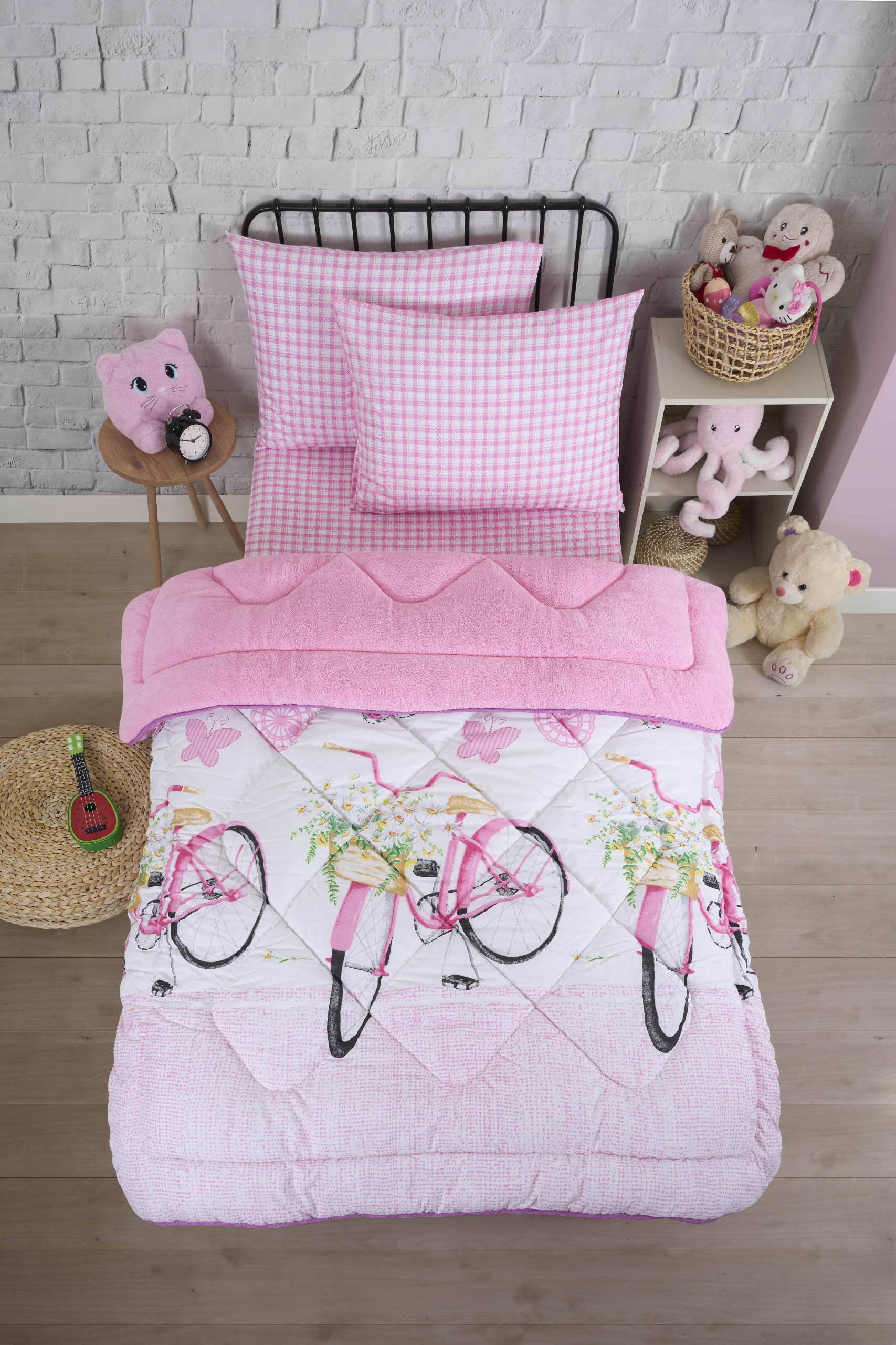 Tek Kişilik Uyku Seti Çift Taraflı Wellsoft Pofuduk Polar Yorgan Yastık Kılıfı ve 100x200 Lastikli Çarşaf Pudra Bisiklet