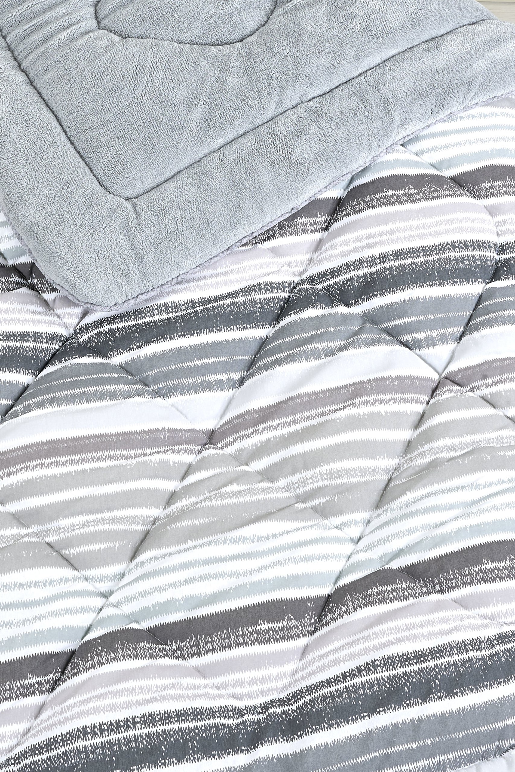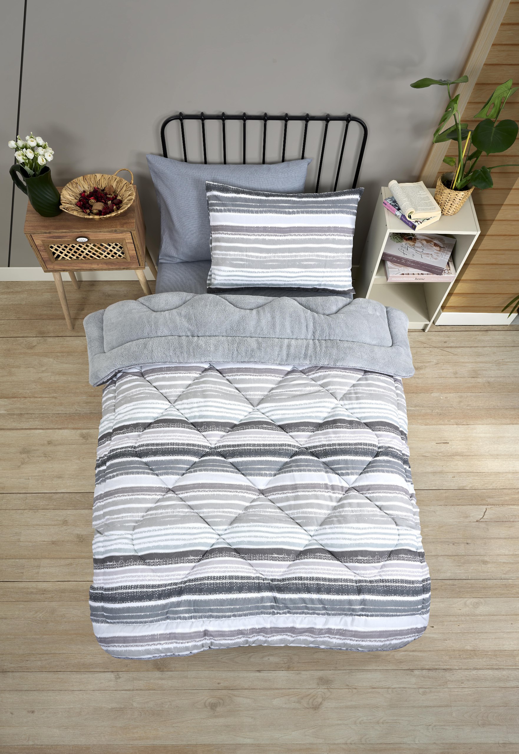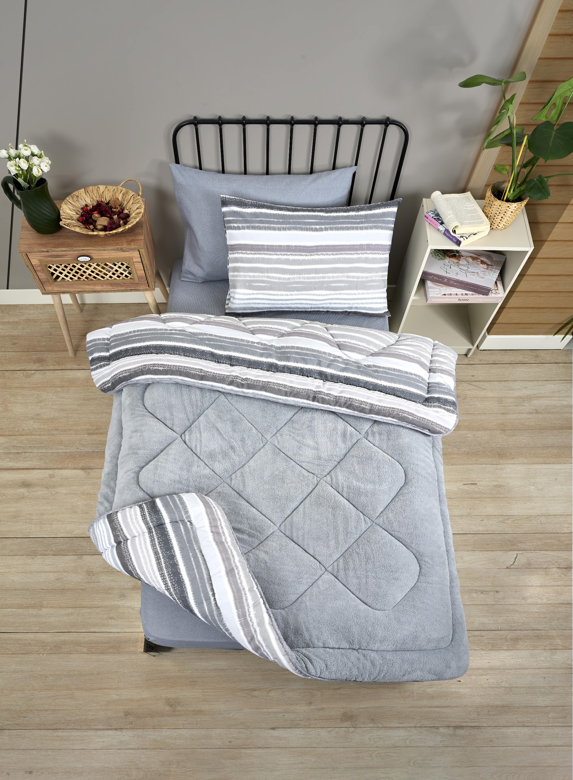 Tek Kişilik Uyku Seti - Çift Taraflı Wellsoft Pofuduk Polar Yorgan, Yastık Kılıfı ve 100x200 Lastikli Çarşaf - Tasel Gri