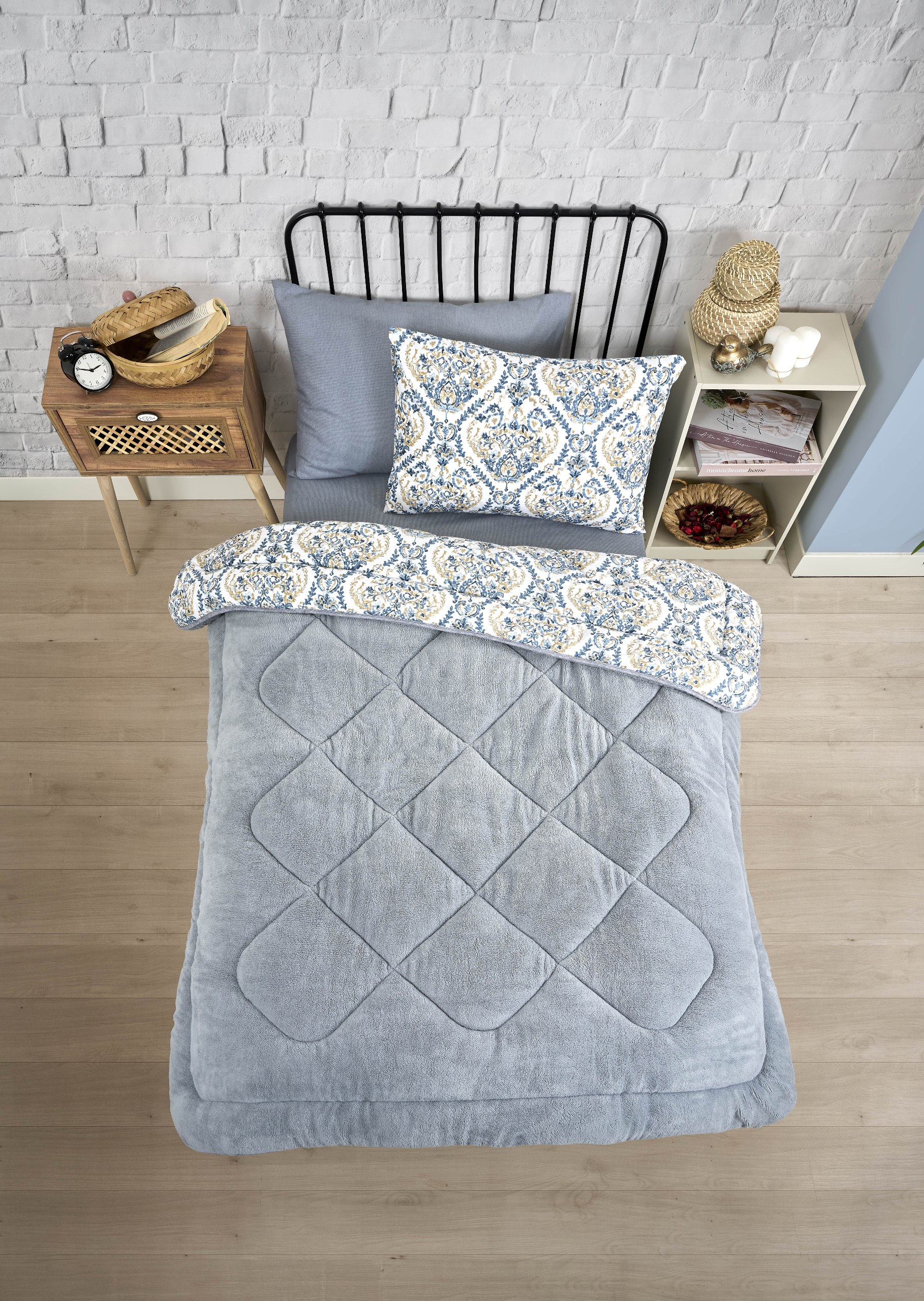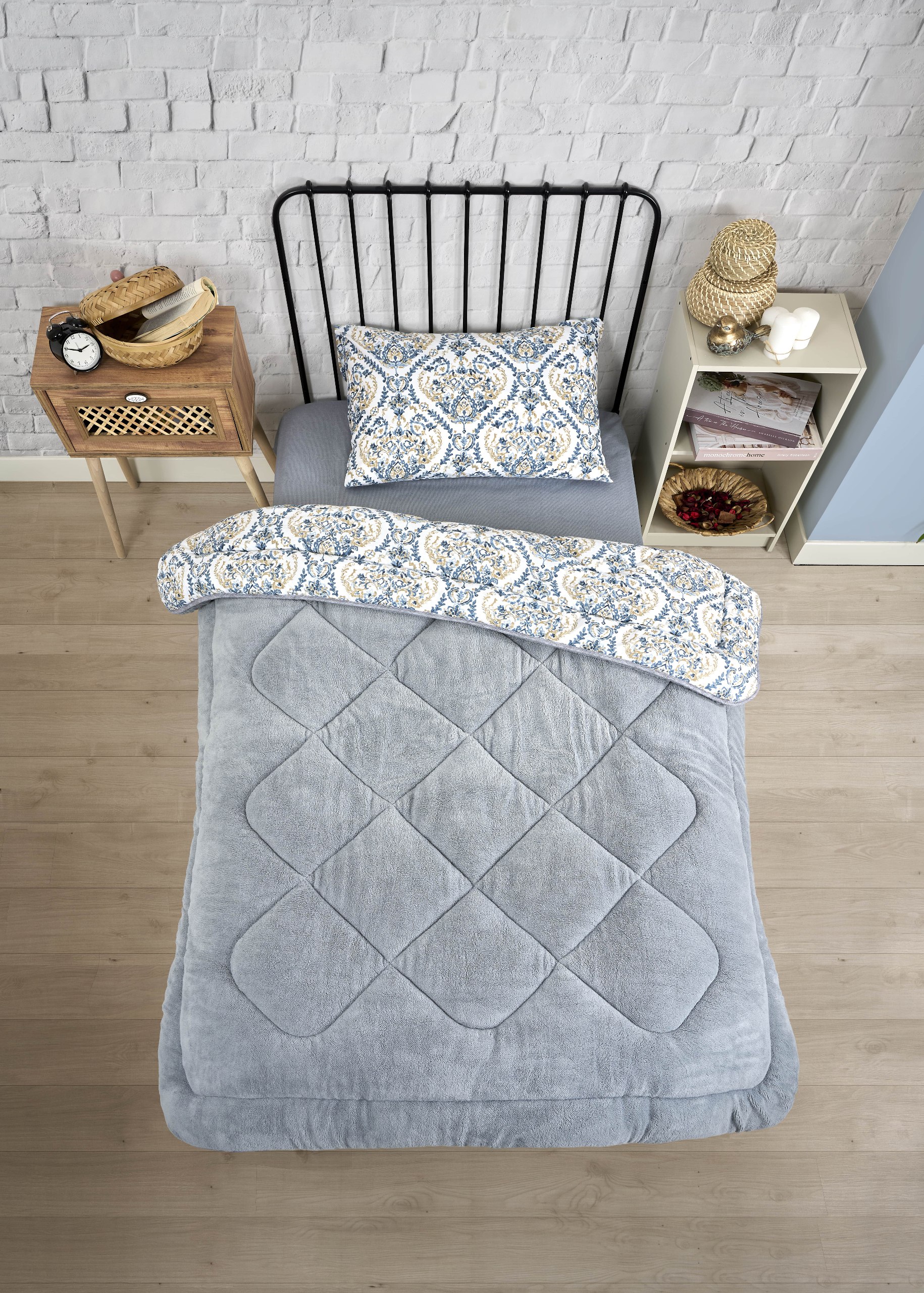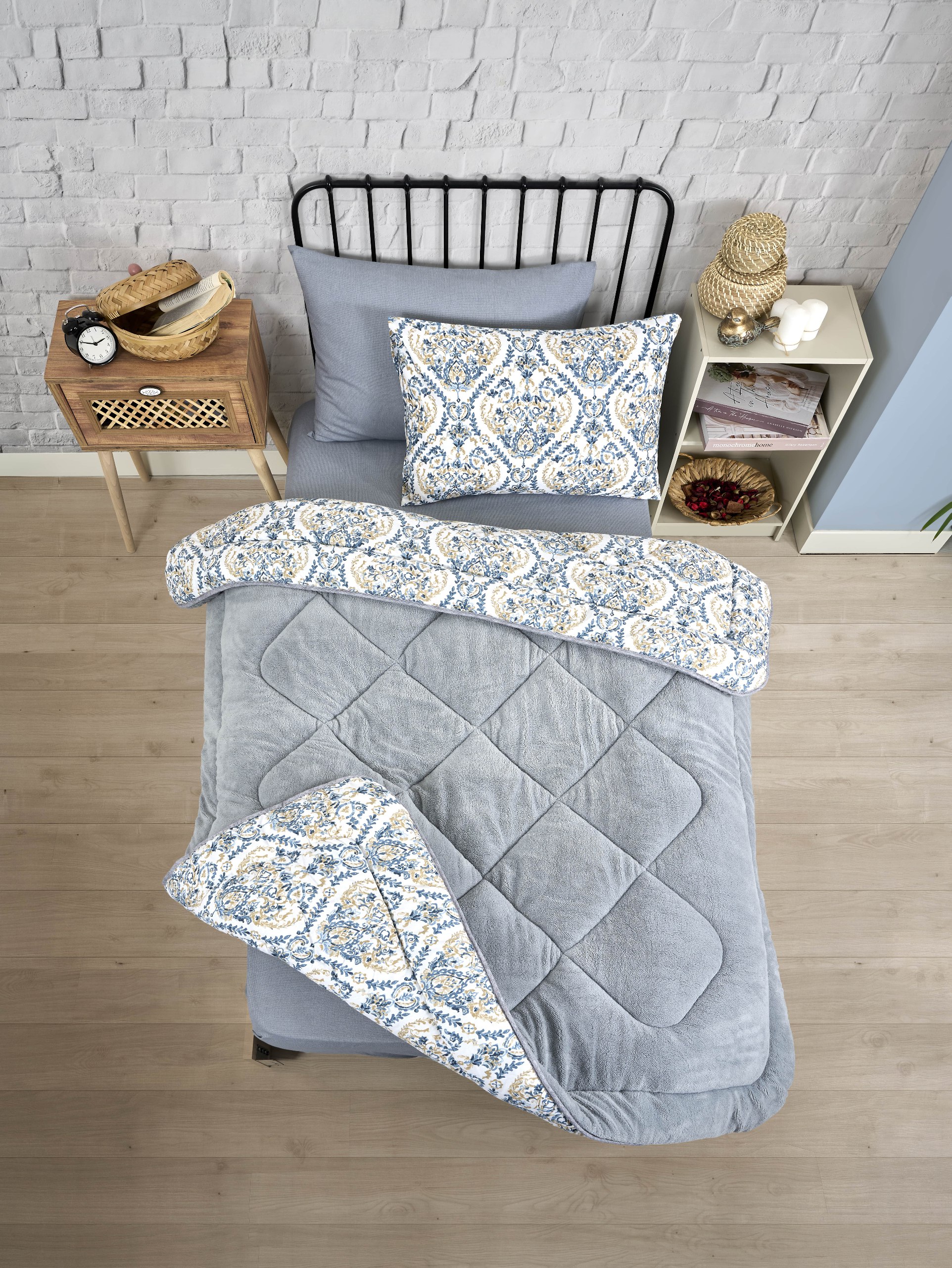 Tek Kişilik Yorgan Seti Lüx Çift Taraflı Pofuduk AKSU GRİ